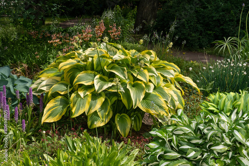 Fototapeta premium Different varieties of hosta bushes a background of luxurious garden