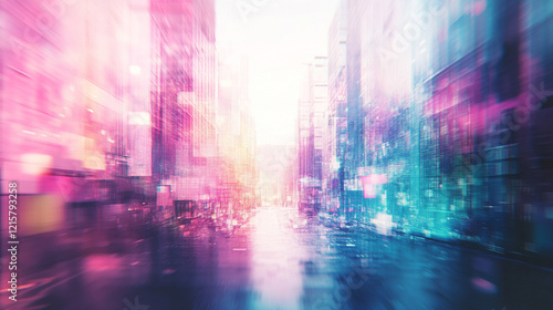 Obraz premium Digital abstract cityscape background with glitchy pixelated electric blues, purples, greens, pinks, whites, and turquoise in a minimalistic bright tone with empty blank caption space on the side