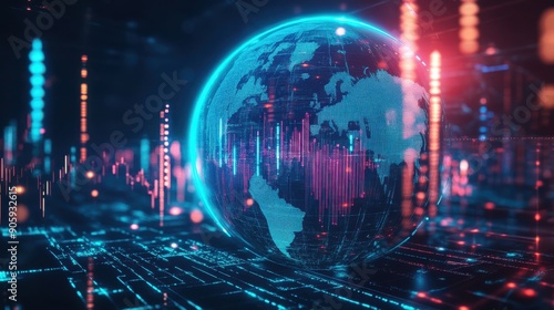Obraz premium Digital abstract globe, bar graphs showing currency exchange rates, glowing lines, futuristic finance theme, blue and neon accents, highresolution