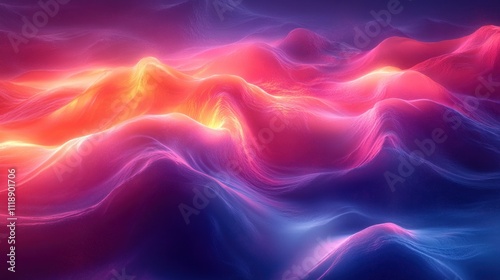 © littlekid, Fototapeta premium Digital Abstract Landscape Flowing Waves Neon Colors 3D Background Technology Network Storage Education
