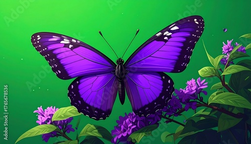 Naklejka premium Digital art A large purple butterfly rests atop flowering purple blossoms against a vibrant, saturated green backdrop