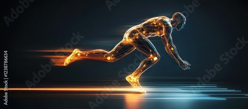 Fototapeta premium Digital athlete sprinting, glowing lines, dark background, speed concept