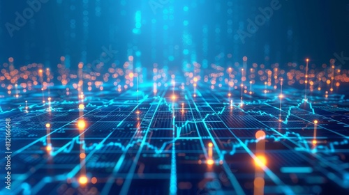 © tanapat, Obraz premium digital background of stock market charts and graphs on blue, with data points glowing in the foreground