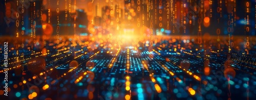 © EnelEva, Naklejka premium Digital binary code background with glowing lights and bokeh effect.