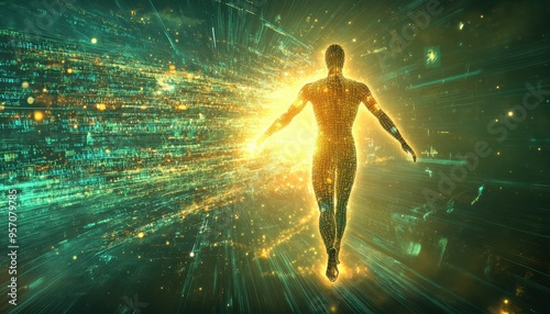 Fototapeta premium Digital Binary Dreamscape: Glowing Humanoid Figure in Abstract Technological Environment