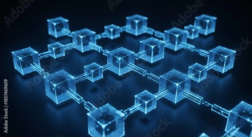 Fototapeta premium Digital blockchain network of interconnected glowing blue cubes on a dark...