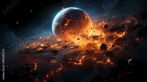 Fototapeta premium Digital blue and orange broken planet poster background