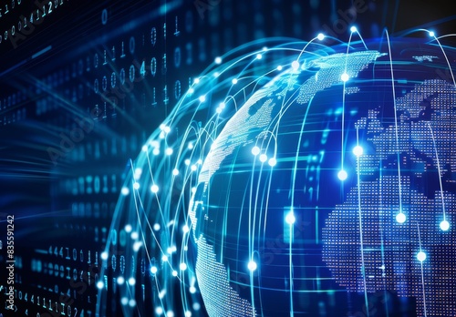 Fototapeta premium Digital blue background with glowing lines and binary code on the globe,...