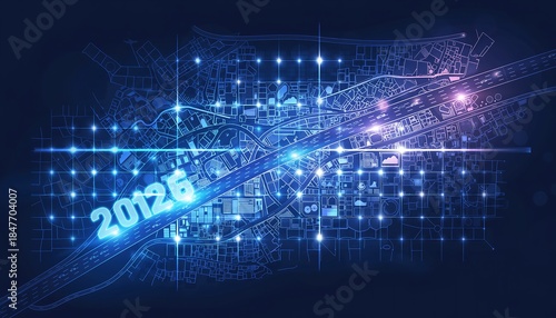 © David, Obraz premium Digital Blueprint of Future Cityscape with Year 2026 Overlay