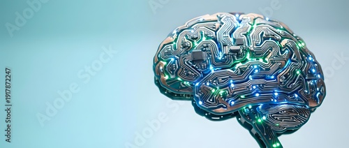 Fototapeta premium Digital brain with circuit patterns and glowing neural networks on gradient background for artificial intelligence and technology concepts.