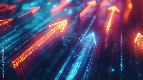 © ai_artist, Obraz premium Digital Bunch of Glowing Arrows Up Diagonally - Abstract Boost Concept