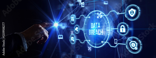 © photon_photo, Naklejka premium Digital business and technology concept, virtual screen showing DATA BREACH.