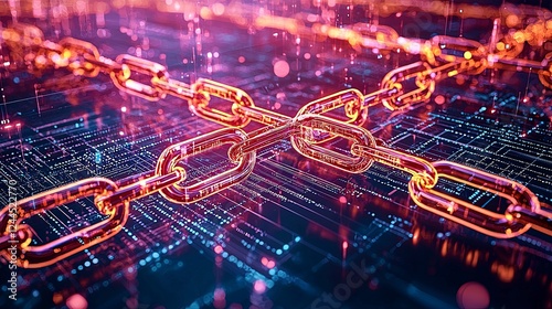 Obraz premium Digital chains interlinking against a vibrant, tech-inspired background,...