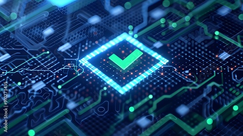 Obraz premium Digital check mark on a blue circuit board representing data verification,...