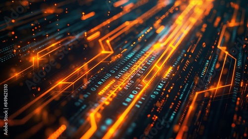 Fototapeta premium Digital circuit board with dynamic orange lines. Symbolizes high-tech,...