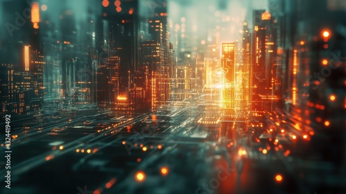 © Johannes, Naklejka premium Digital circuit microchip on abstract background. Computing and technology concept. 3D Rendering