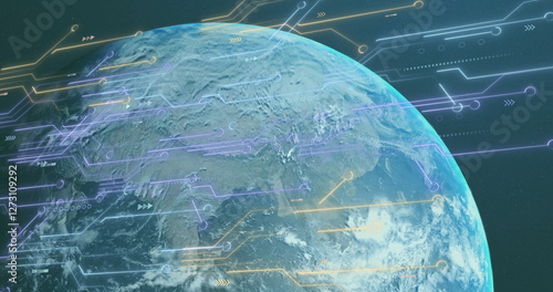 Naklejka premium Digital circuits and data processing over image of Earth from space