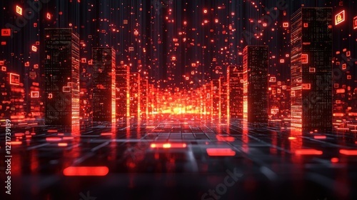 © Dece Std, Fototapeta premium Digital city, data rain, glowing skyscrapers, futuristic urban landscape