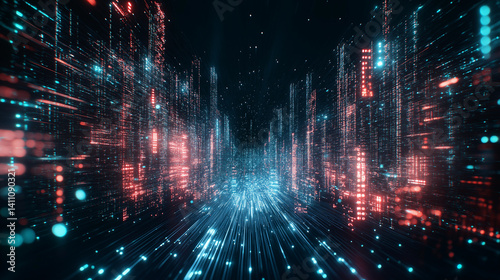 Fototapeta premium Digital Cityscape: A captivating, futuristic city comes to life, rendered in vibrant digital light. The image features a network of interconnected structures.