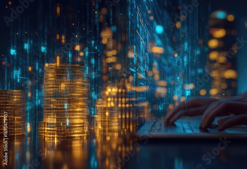 © Akbar, Naklejka premium Digital cityscape, person typing on laptop, abstract city, glowing data