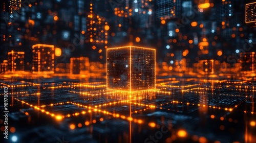 Obraz premium Digital Cityscape with Glowing Cube