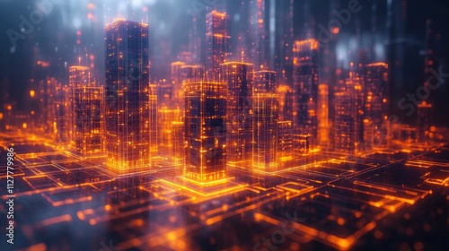© INFAYUFA, Fototapeta premium Digital Cityscape with Glowing Towers and Circuitry