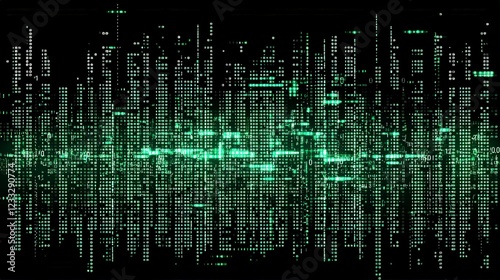 © Biggy, Fototapeta premium Digital Cityscape with Green Binary Code Flowing on Dark Background