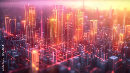 Fototapeta premium Digital Cityscape with Luminous Skyscrapers and Data Streams, Symbolizing...