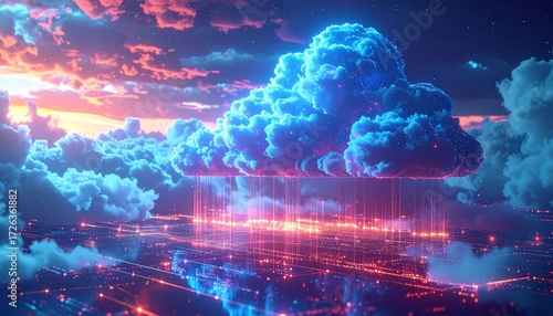 © EnelEva, Obraz premium Digital cloud computing concept with blue light energy and motion pattern background and glowing clouds illustration