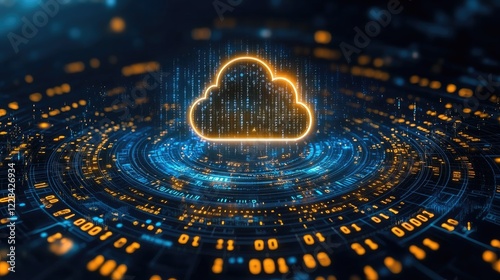 © Arvi, Fototapeta premium Digital cloud computing concept with glowing cloud icon surrounded by data streams and binary code