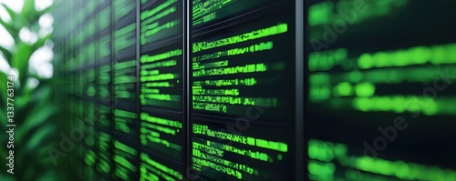 © Teerapat, Obraz premium Digital Code Display with Green Text on Dark Background in Nature