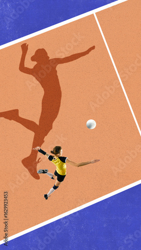 Naklejka premium Digital collage of female volleyball player in mid-air serve with strong shadow on court. Concept of self-belief, sport empowerment, motivation in training, and youth identity through action.