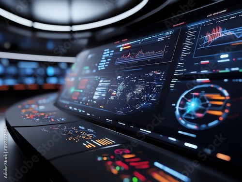 Obraz premium Digital command center, futuristic graphics, immersive interactive panels, 3D...