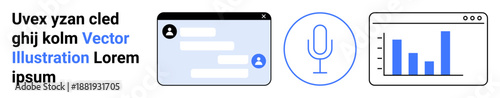 Fototapeta premium Digital communication, data presentation, voice technology, analytics, online services, media interfaces. Includes chat interface, microphone icon bar chart in browser window. Communication and data