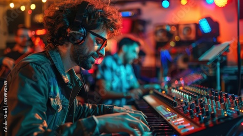 Obraz premium Digital Composer: Musician Presenting Futuristic Composition to Band in...