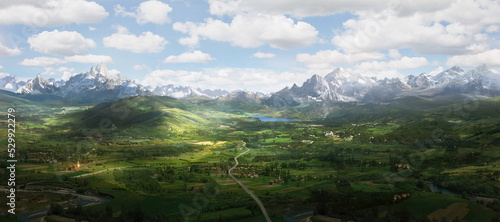 Fototapeta premium Digital composite illustration of a cinematic fantasy landscape with valleys, rivers and mountains.