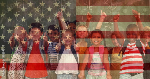 Naklejka premium Digital composite of multi-ethnic group of children at school with blackboard against american flag