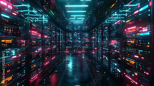 Fototapeta premium digital corridor with glowing neon lights and data servers, perfect for...