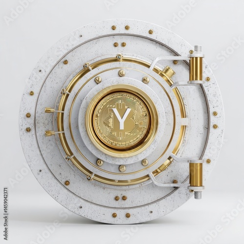 © Seno, Naklejka premium Digital cryptocurrency coin in a secure vault setting with gold accents