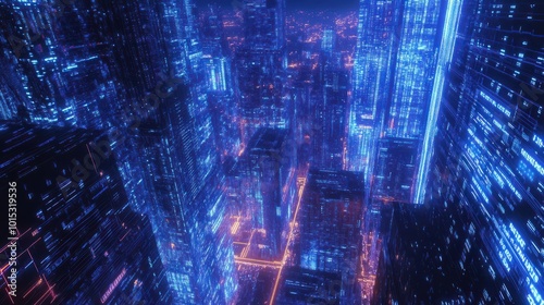 Fototapeta premium Digital cyberspace with streams of glowing blue data, resembling a futuristic cityscape at night.