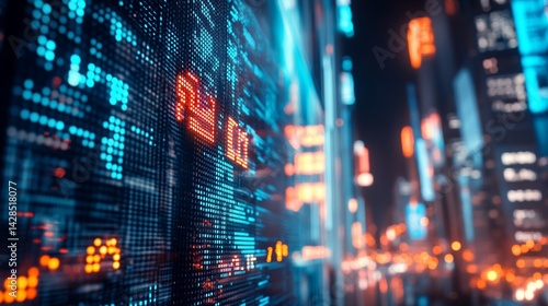 © Novia, Obraz premium Digital Data Display with Cityscape Background, stock market values screen glowing at night
