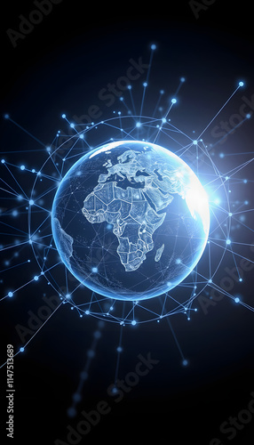 © Go, Fototapeta premium Digital data network conveying global abstract illustration of a scientific technology data network surrounding planet earth conveying connectivity, studio lighting, with white tones