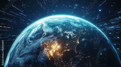 © artzone, Obraz premium Digital data streams flow around the Earth at night.