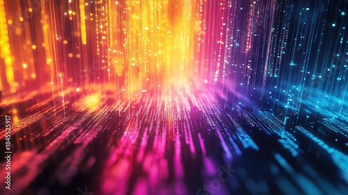 Fototapeta premium Digital data streams surge across a vibrant technology network, glowing particles and fiber optic lines visualize fast, dynamic information flow, global connectivity and futuristic transfer