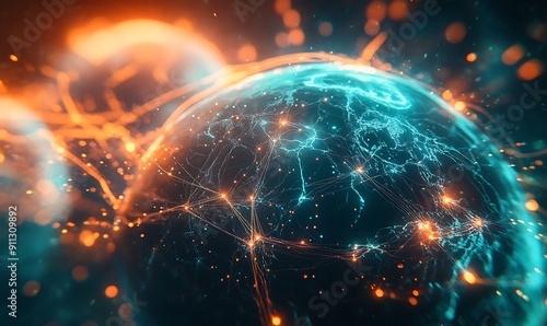 © AhmadTriwahyuutomo, Obraz premium Digital Data Synergy with Glowing Pathways Forming a Web Over a Stylized Globe