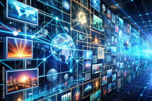 © Ariful, Obraz premium Digital data technology background with blue light Digital cyber space High speed internet digital data transfer future technology