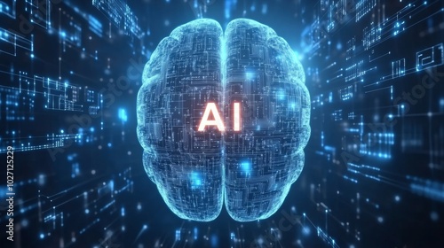 Obraz premium Digital depiction of an AI brain with bright neural connections and data...