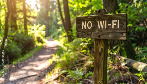 © ANGEL4289, Obraz premium Digital detox screen time concept. Nature trail with a "No Wi-Fi" sign, inviting disconnection.