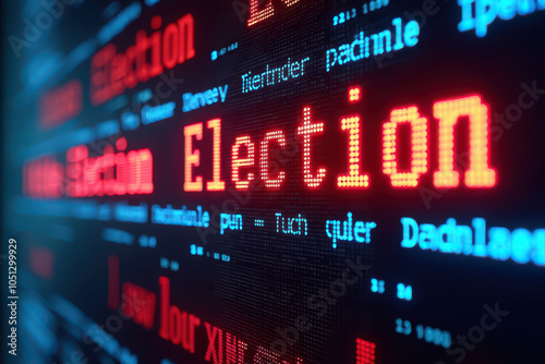 © Pixels Views, Obraz premium Digital display board with scrolling text, modern and electronic style with LED lights. Horizontal layout showing 'Election' in bold red letters.