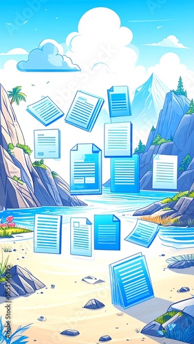 © Barokah, Fototapeta premium Digital documents float over tropical beach